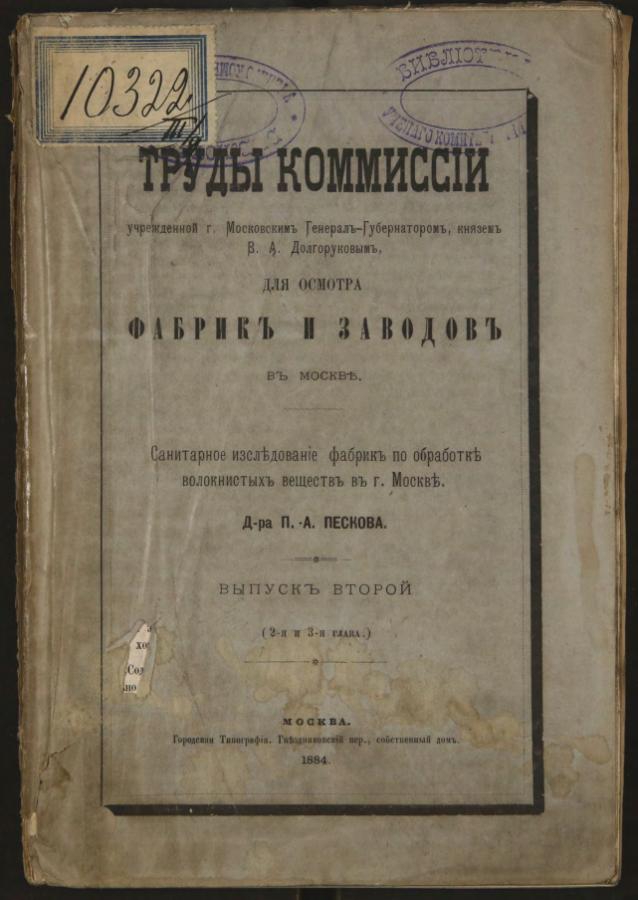Труды комиссии Учрежденной г. Московским Генерал-Губернатором, князем В.А. Долгоруковым для осмотра фабрик и заводов в Москве. Санитарное исследование фабрик по обработке волокнистых веществ в г. Москва.
