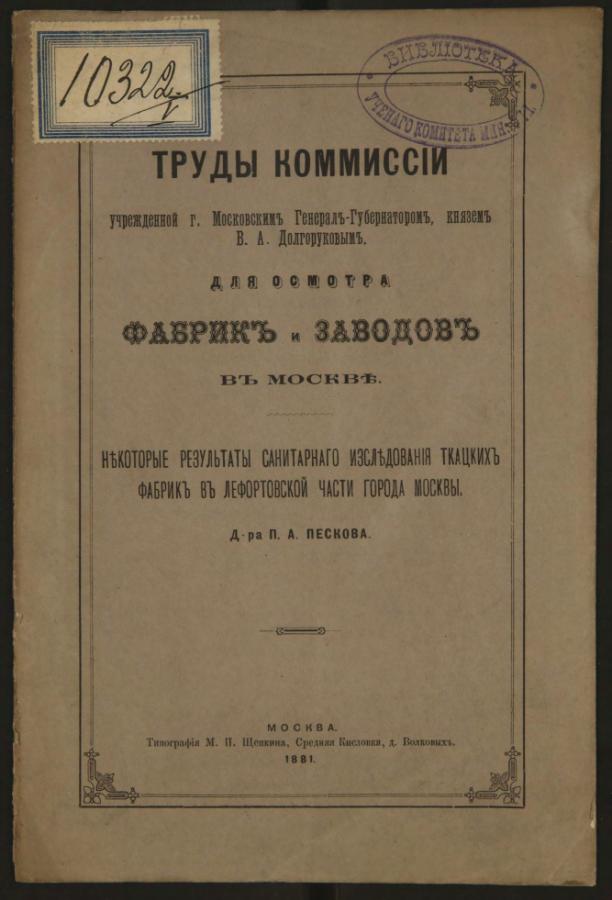 Труды комиссии Учрежденной г. Московским Генерал-Губернатором, князем В.А. Долгоруковым для осмотра фабрик и заводов в Москве. Некоторые результаты санитарного исследования ткацких фабрик в Лефортовской части г. Москвы