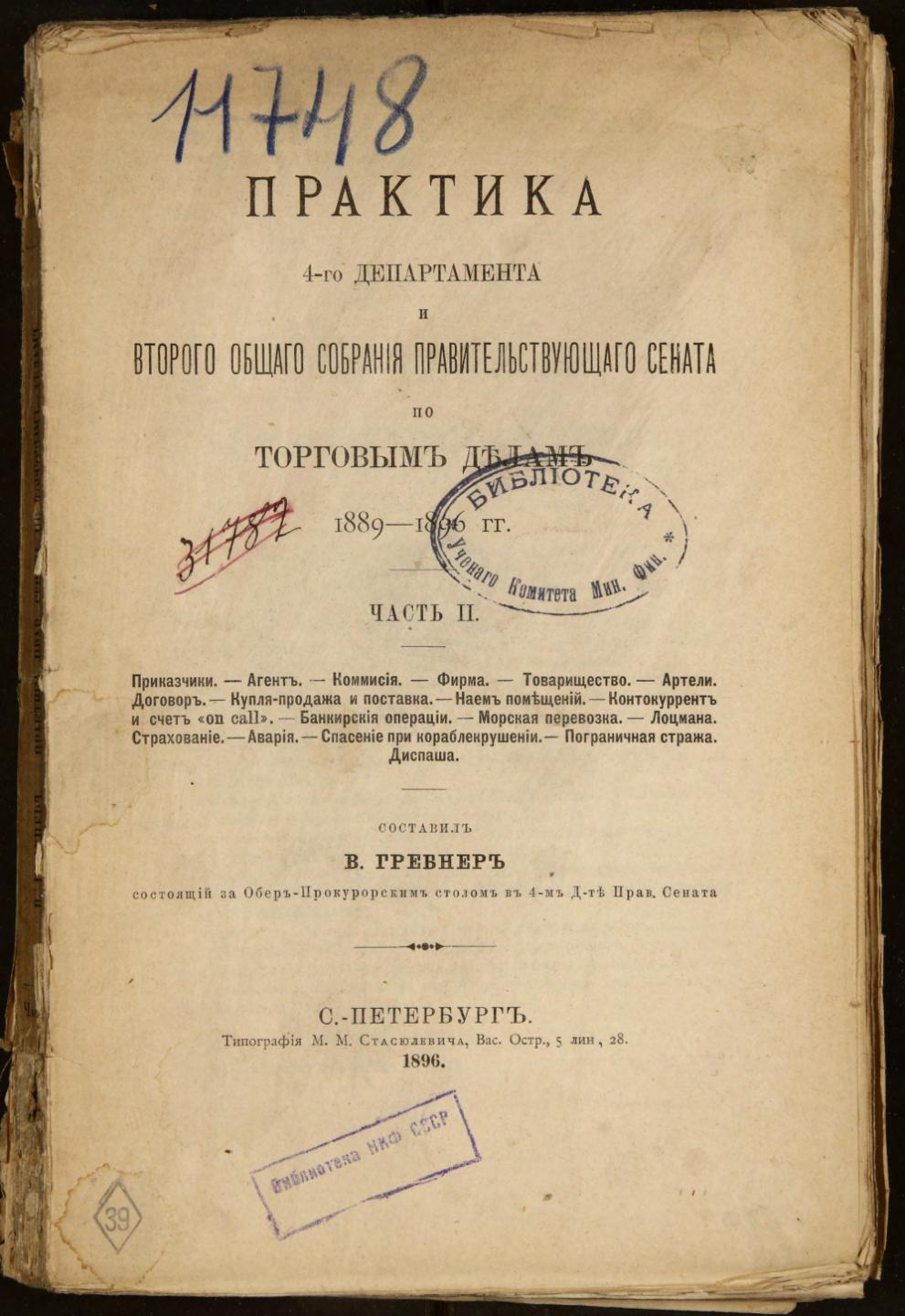 Практика 4-го департамента и второго общего собрания Правительствующего сената по торговым делам 1889-1896 гг. Ч.2