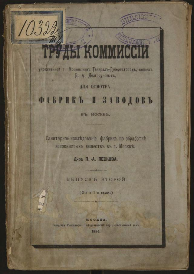 Труды комиссии Учрежденной г. Московским Генерал-Губернатором, князем В.А. Долгоруковым для осмотра фабрик и заводов в Москве. Санитарное исследование фабрик по обработке волокнистых веществ в г. Москва