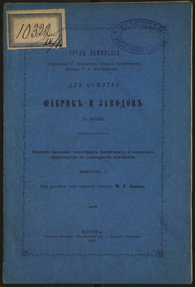Труды комиссии Учрежденной г. Московским Генерал-Губернатором, князем В.А. Долгоруковым для осмотра фабрик и заводов в Москве. Описание состояния некоторых фабричных и заводских производств в санитарном отношении