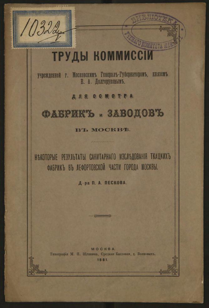 Труды комиссии Учрежденной г. Московским Генерал-Губернатором, князем В.А. Долгоруковым для осмотра фабрик и заводов в Москве. Некоторые результаты санитарного исследования ткацких фабрик в Лефортовской части г. Москвы