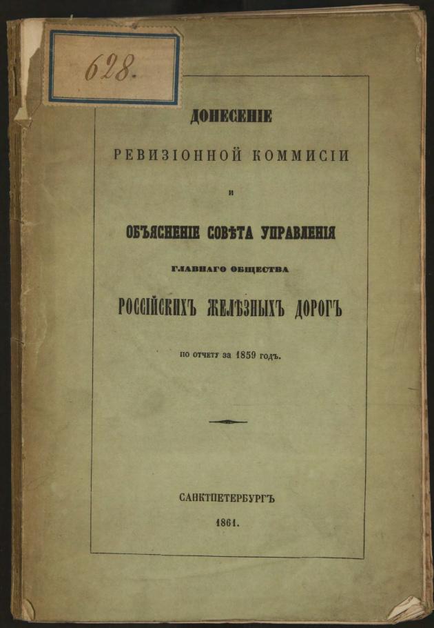 - Донесение Ревизионной комиссии, назначенной 2/14 июня 1860 г. общим собранием акционеров Главного общества российских железных дорог для рассмотрения и утверждения счетов за 1859 год и объяснение Совета управления