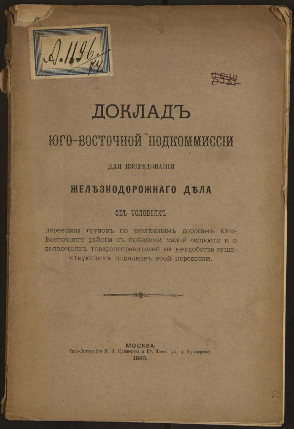 - Доклад Юго-Восточной подкомиссии для исследования железнодорожного дела об условиях перевозки грузов по железным дорогам Юго-Восточного района с поездами малой скорости и о заявлениях товаропроизводителей на неудобства существующих порядков этой перевозки