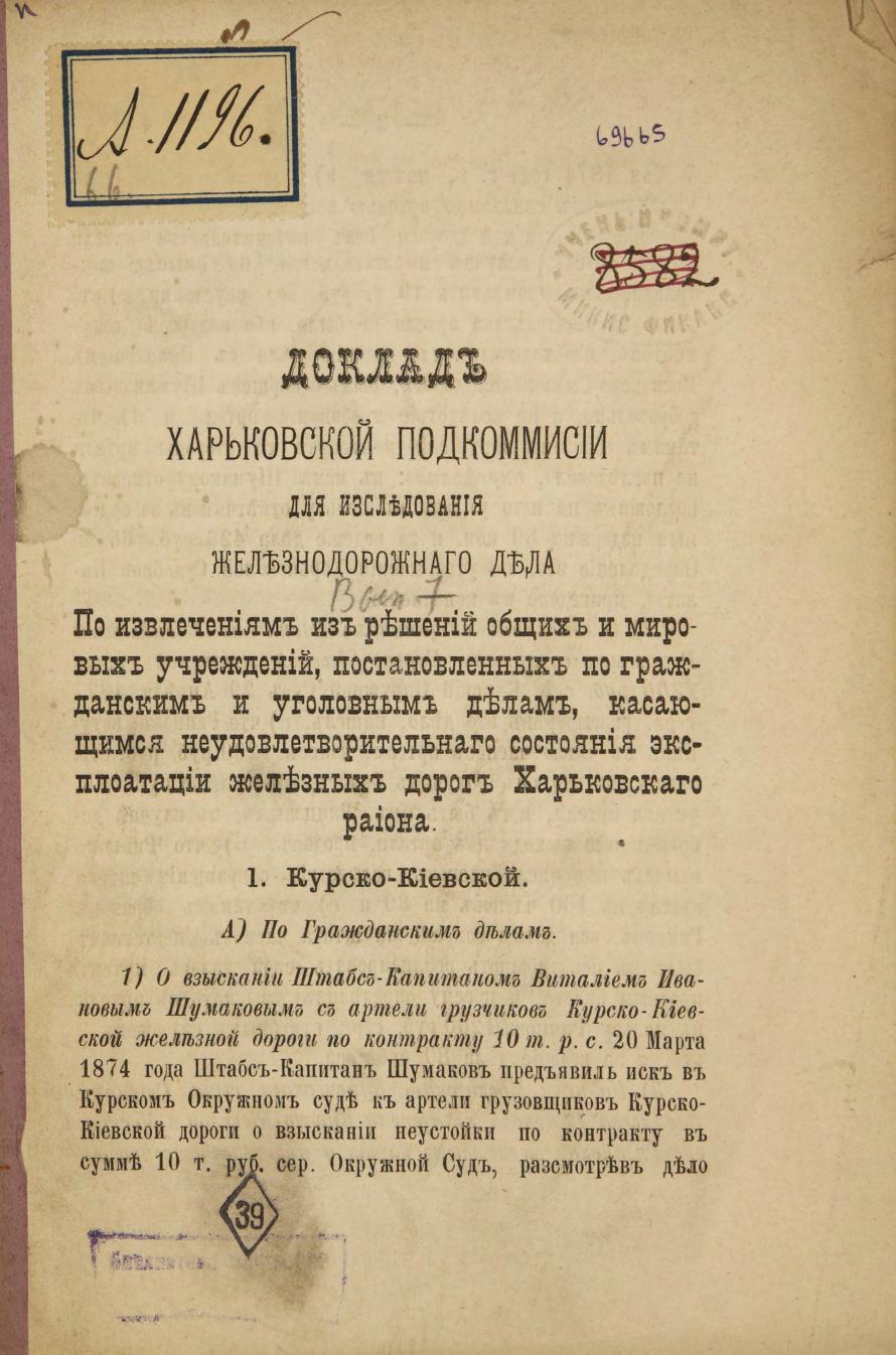 Доклад Харьковской подкомиссии для исследования железнодорожного дела. По извлечениям из решений общих и мировых учреждений, постановленных по гражданским и уголовным дела, касающимся неудовлетворительного состояния эксплоатации железных дорог Харьковского района