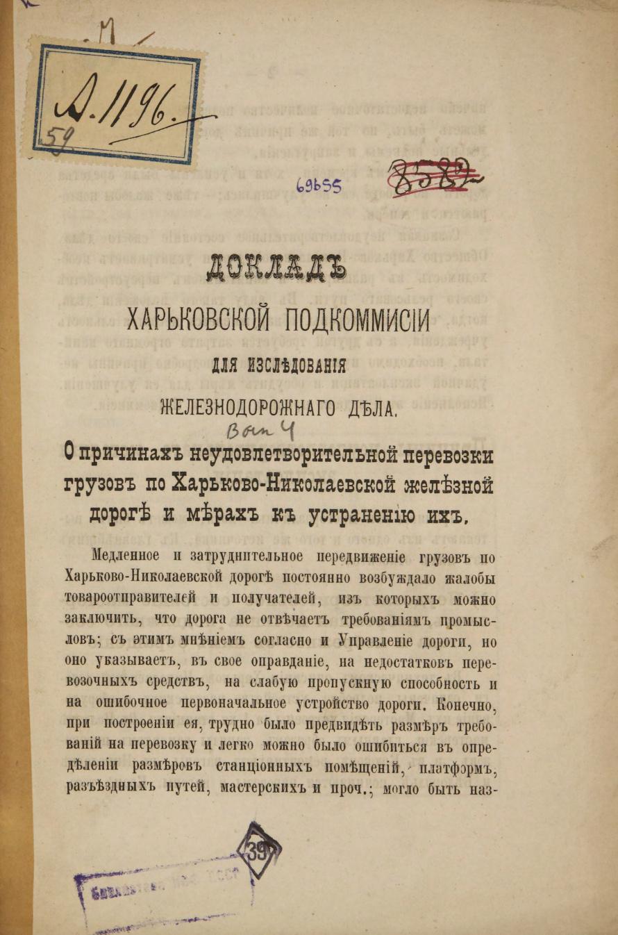 - Доклад Харьковской подкомиссии для исследования железнодорожного дела. О причинах неудовлетворительной перевозки грузов по Харьковско-Николаевской железной дороге и мерах по устранению их