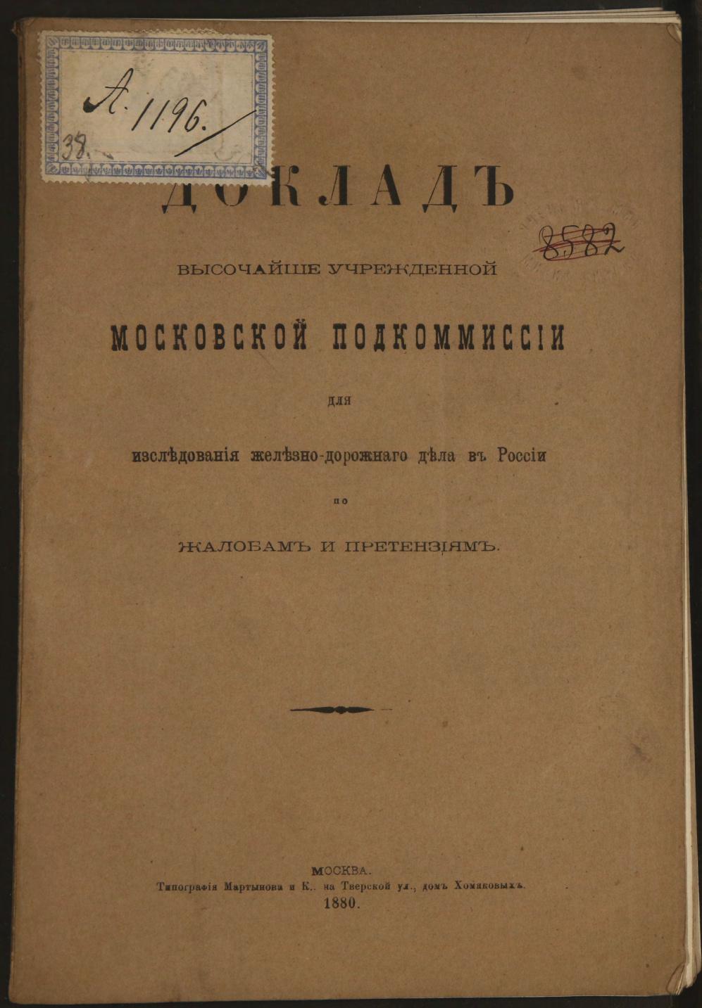 Доклад Высочайше утвержденной Московской подкомиссии для исследования железнодорожного дела в России по жалобам и претензиям