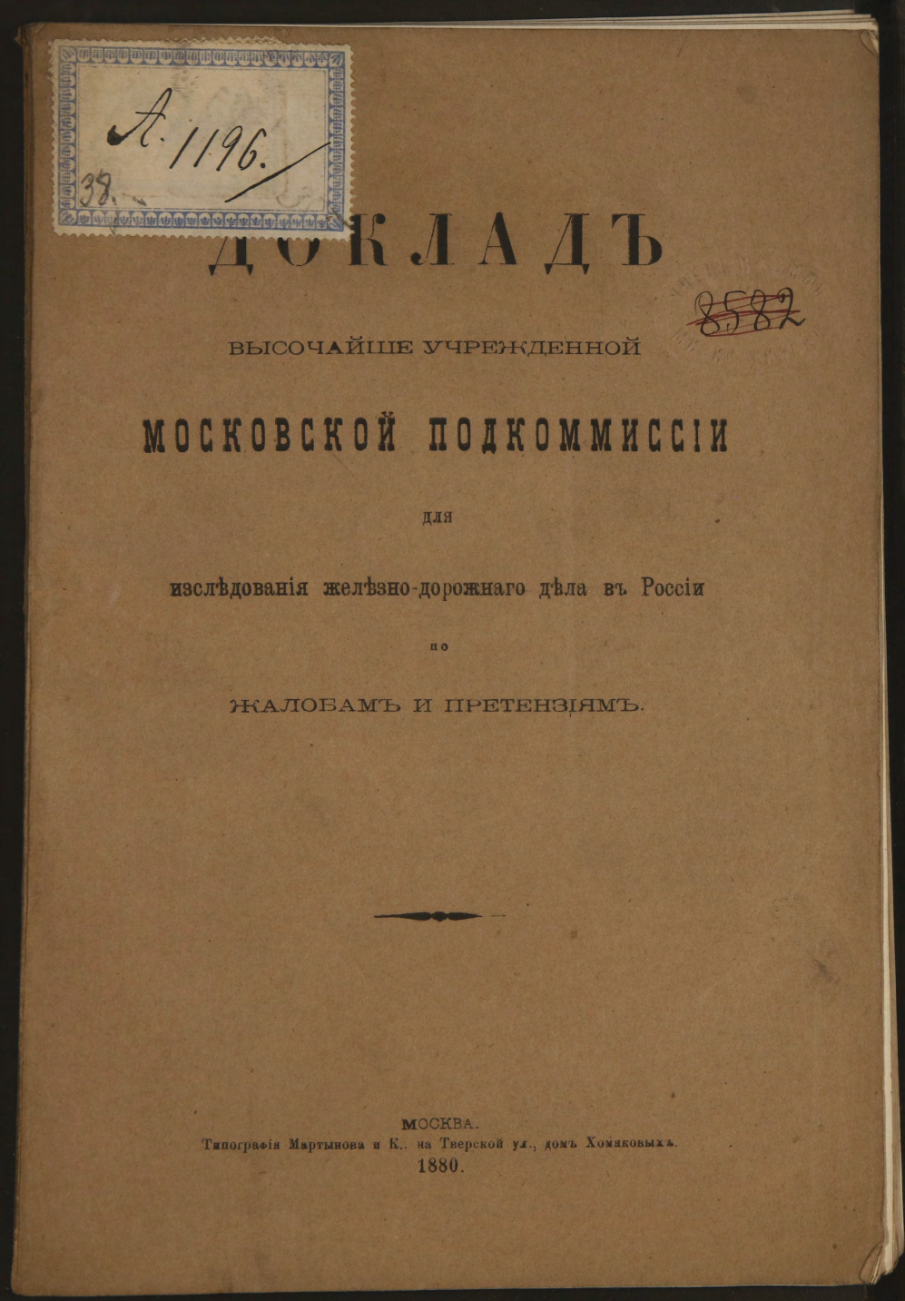- Доклад Высочайше утвержденной Московской подкомиссии для исследования железнодорожного дела в России по жалобам и претензиям