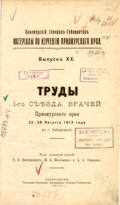 Труды 1-го съезда врачей Приамурского края 23–28 августа 1913 г. в г. Хабаровске