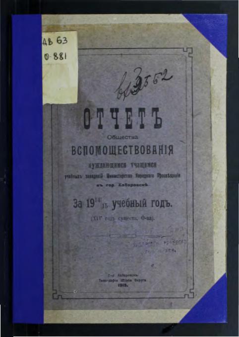- Отчет общества вспомоществования нуждающимся учащимся учебных заведений Министерства народного просвещения в гор. Хабаровске за 1914/15 учебный год