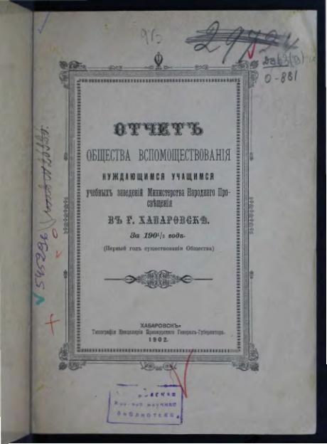 - Отчет общества вспомоществования нуждающимся учащимся учебных заведений Министерства народного просвещения в гор. Хабаровске за 1901/2год
