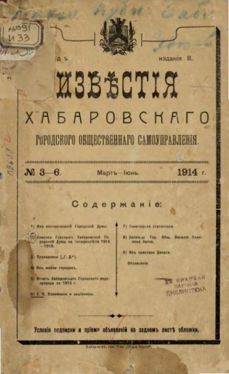 Известия Хабаровского городского общественного самоуправления № 3–6. Март-Июнь. 1914 г.