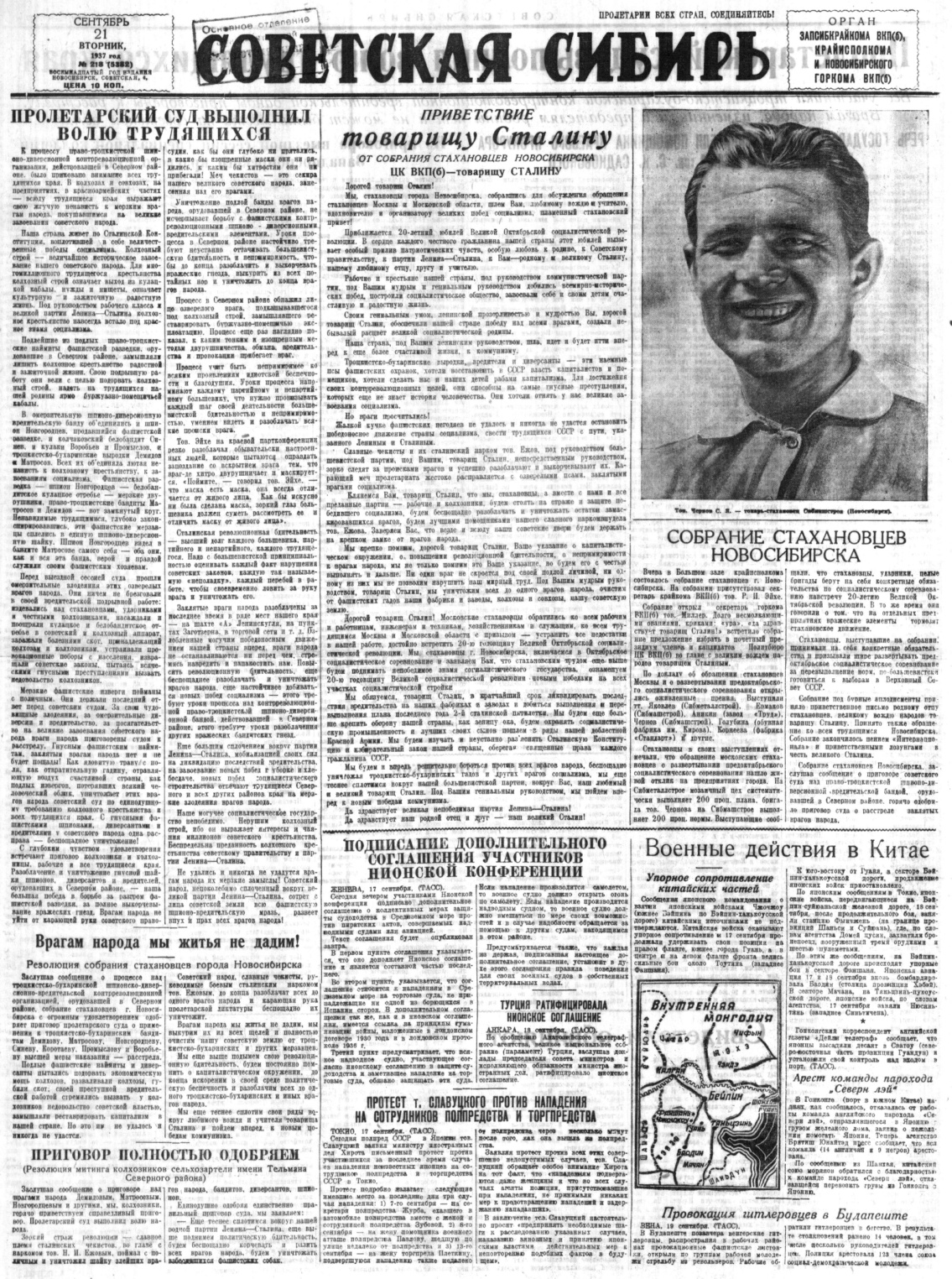 Отчет корреспондента газеты «Советская Сибирь» «Пролетарский суд выполнил волю трудящихся края». 21 сентября 1937 г.