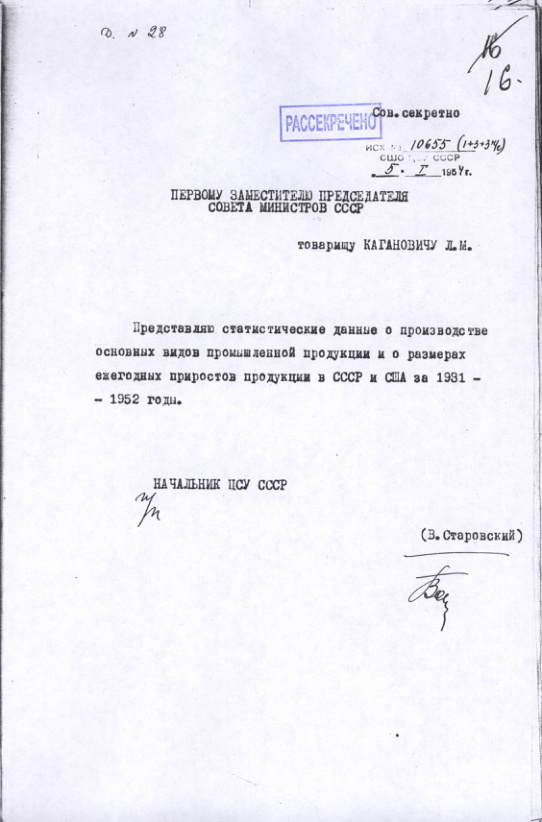- Справка ЦСУ с данными о производстве основных видов промышленной продукции в СССР и США в период с 1931 по 1952 год. 5 января 1954 г.