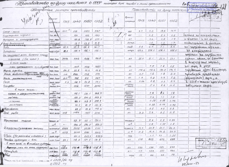 - Производство на душу населения в СССР некоторых видов пищевой и легкой промышленности в 1913, 1940, 1950, 1952 гг. 22 августа 1953 г.