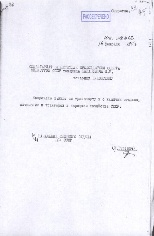 - Таблица с данными о наличии станков, автомашин и тракторов в народном хозяйстве СССР в 1940, 1945, 1950-1951 гг. 16 февраля 1953 г.