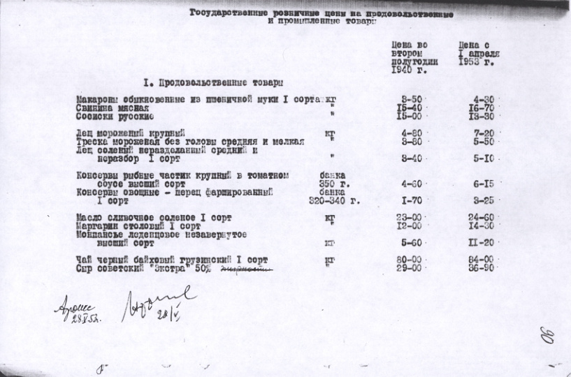 Государственные и розничные цены на продовольственные и промышленные товары в 1940 и 1953 гг. 28 мая 1953 г.
