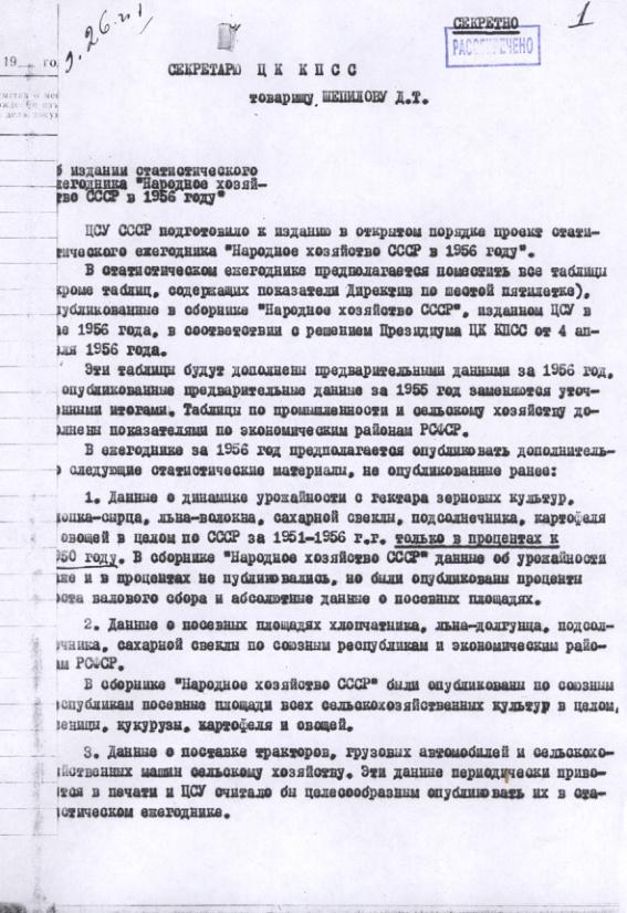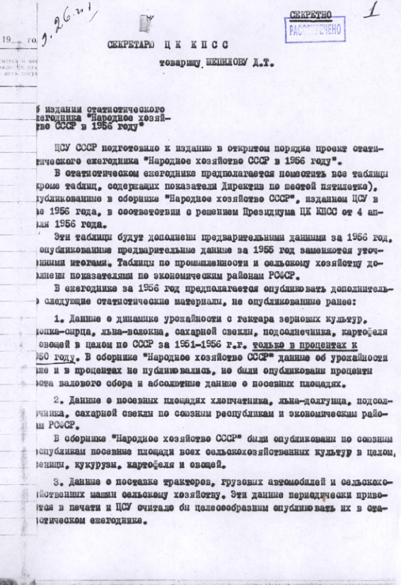 Записка секретарю ЦК КПСС Шепилову Д.Т. об издании статистического ежегодника "Народное хозяйство СССР в 1956 году". 5 марта 1957 года
