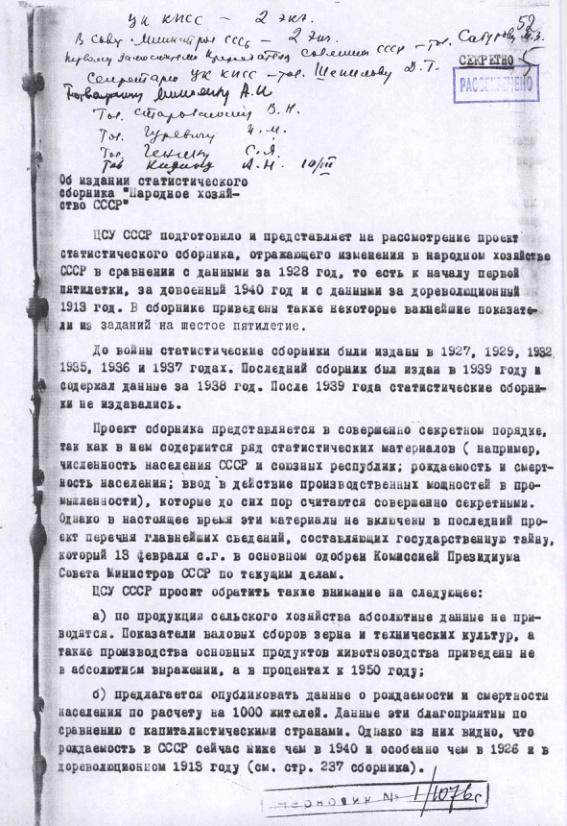 Об издании статистического сборника "Народное хозяйство СССР". 7 марта 1956 г.