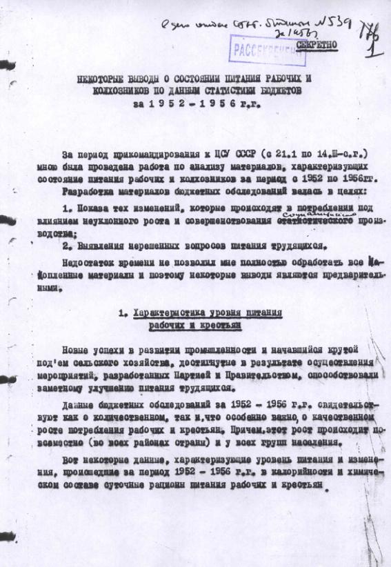 Некоторые выводы о состоянии питания рабочих и колхозников по данным статистики бюджетов за 1952-1956 гг.