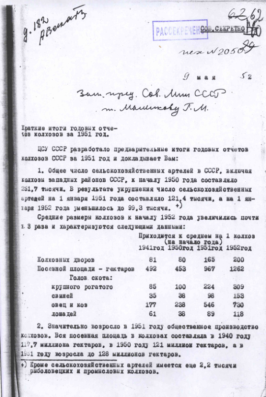 Краткие итоги годовых отчетов колхозов за 1951 год. 9 мая 1952 г.