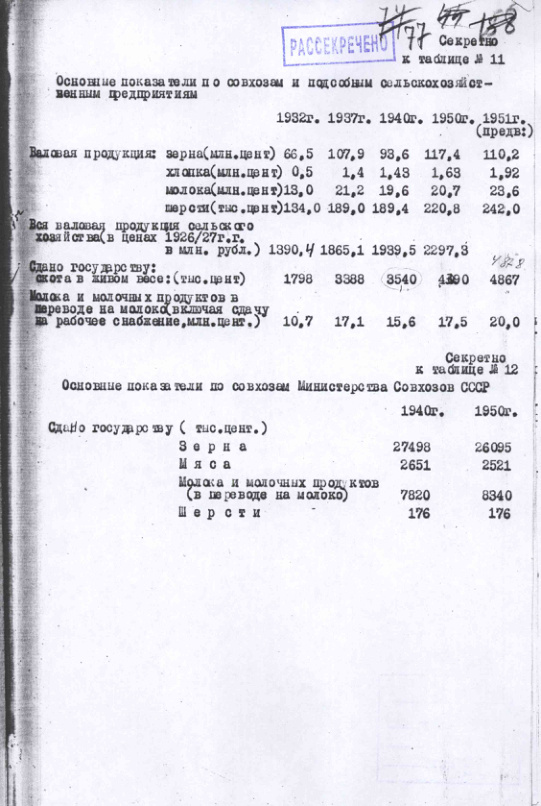 Таблицы с данными по сельскому хозяйству за 1932, 1937, 1940, 1947, 1949, 1950-1951 гг. 31 мая 1952 г.