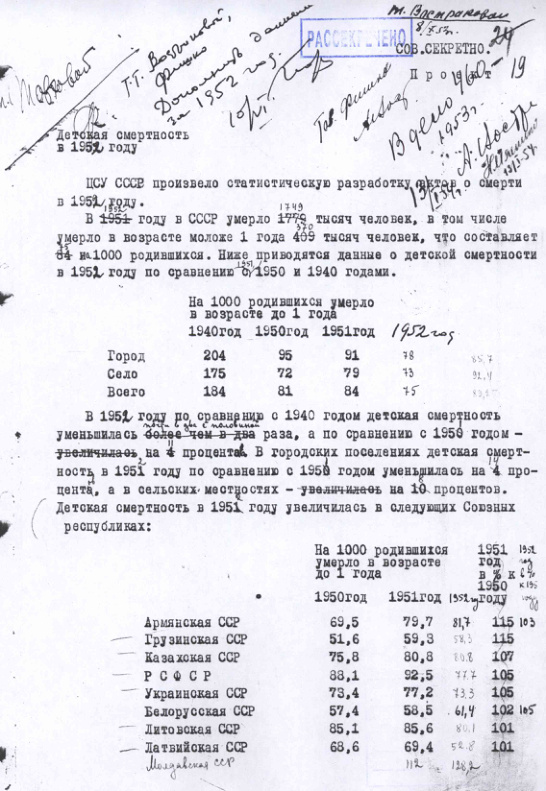 Справка о детской смертности в СССР в 1940, 1950-1952 гг. Декабрь 1952 г.
