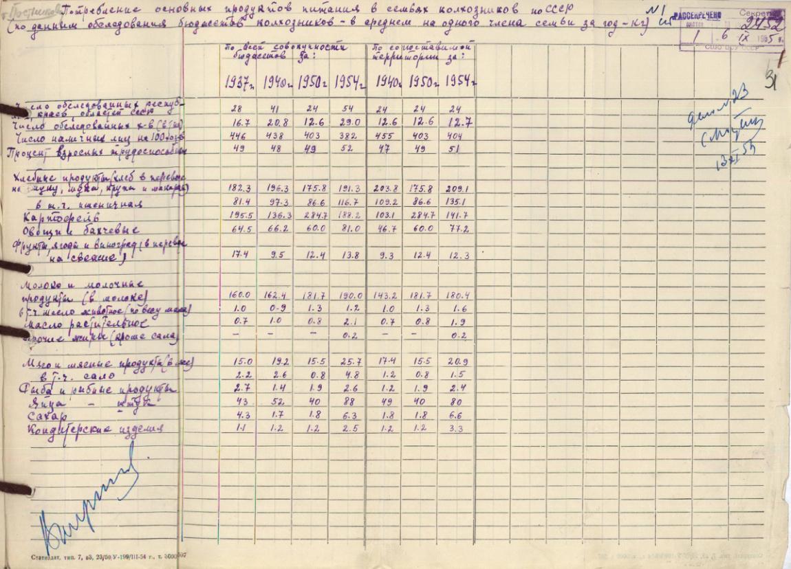 - Потребление основных продуктов питания в семьях колхозников по СССР в 1937, 1940, 1950, 1954 гг.