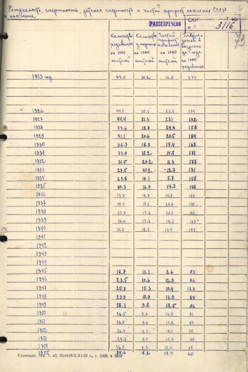 Рождаемость, смертность, детская смертность и чистый прирост населения СССР в 1913, 1926-1955 гг. 12 марта 1957