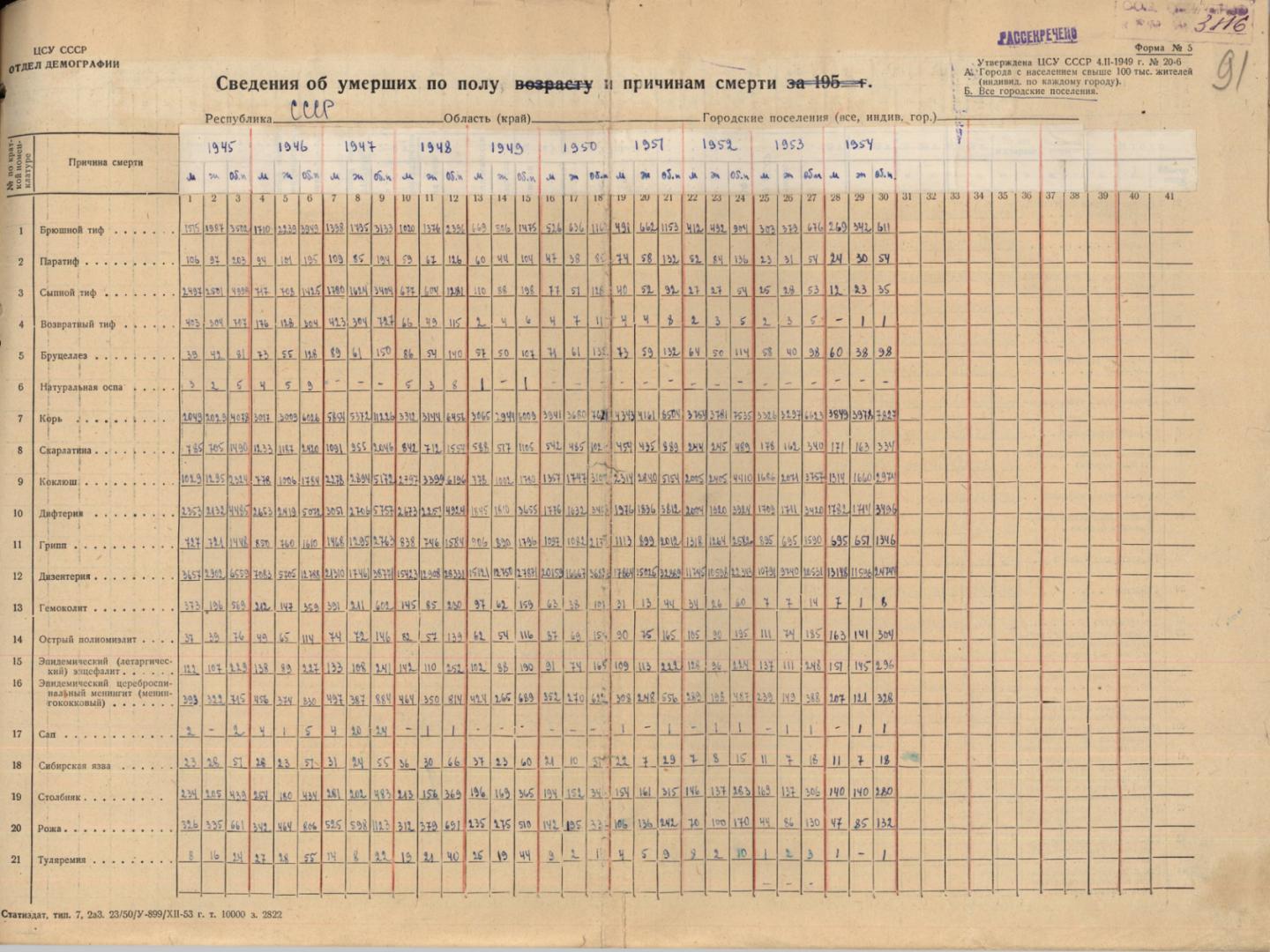 Сведения об умерших по полу и причинам смерти в СССР в 1945-1954 гг. 6 сентября 1957 г.