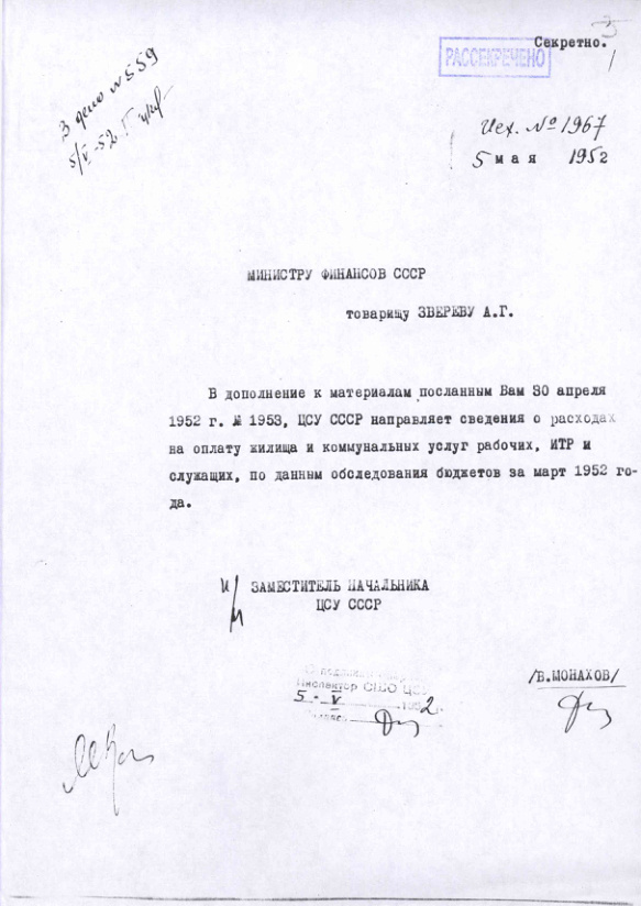 - Сведения о расходах на оплату жилища и коммунальных услуг рабочих, ИТР и служащих, по данным обследования бюджетов за март 1952 года.