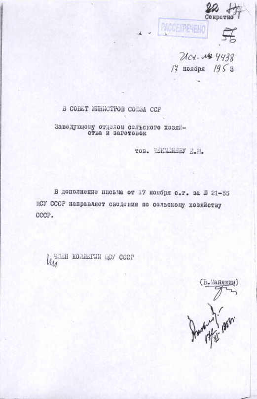 Таблицы с данными по сельскому хозяйству за 1932, 1937, 1940, 1945-1952 гг. 17 ноября 1953 г.
