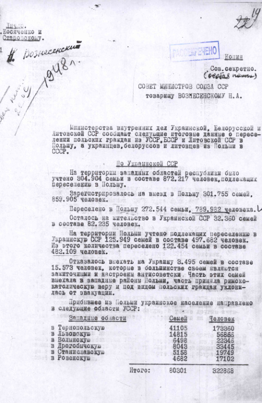 - Справка о переселении польских граждан из УССР, БССР и Литовской ССР в Польшу, а украинцев, белорусов и литовцев из Польши в СССР. 6 ноября 1946 г.