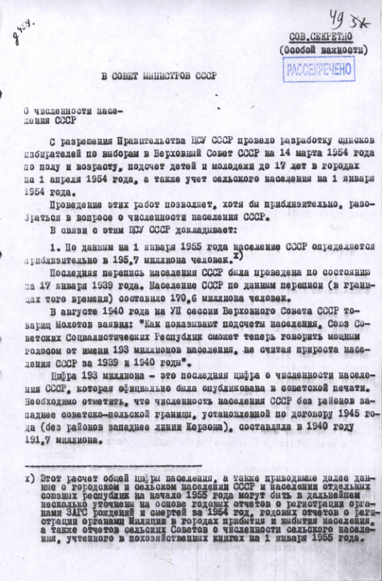 Справка ЦСУ о численности населения СССР на 1 января 1955 г. 21 января 1955 г.