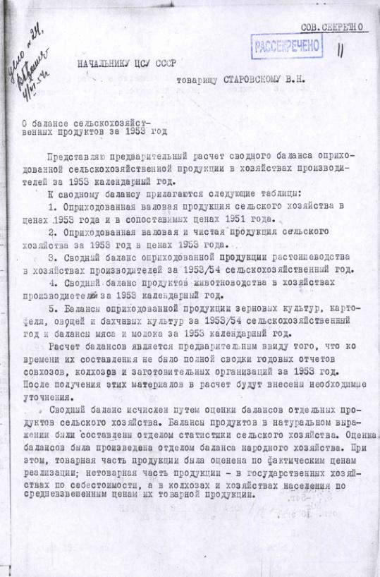 Справка ЦСУ о балансе сельскохозяйственных продуктов за 1953 год. 3 июня 1954 г.