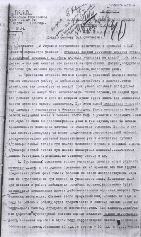 Письмо ЦСУ Украины об оценках состояния посевов. 19 марта 1929 г.