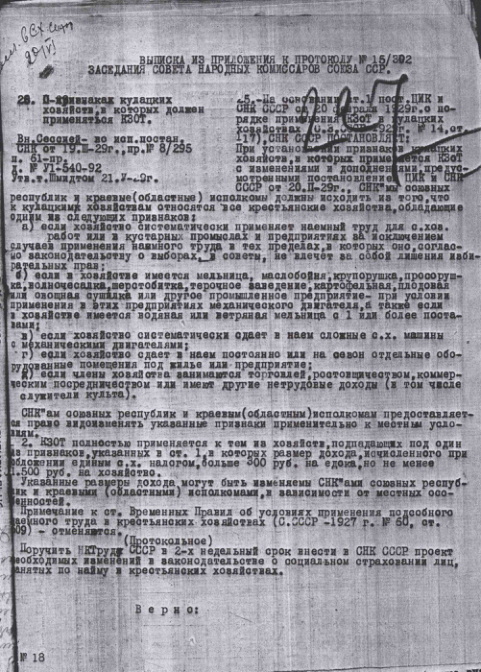 Выписка из приложения к протоколу № 15-302 СНК СССР о признаках кулацких хозяйств. 20 июня 1929 г.