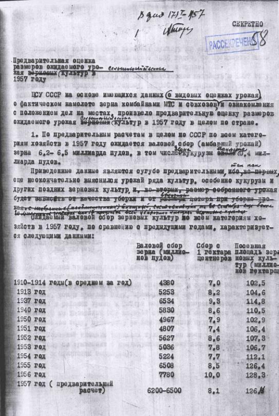 Докладная записка о предварительной оценке размеров урожая в 1957 году.