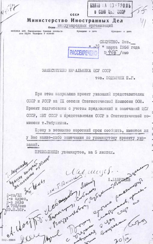 Проект указаний представителям СССР и УССР на IX сессии Статистической Комиссии ООН. 29 марта 1956 г.