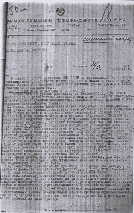 О системе учета урожайности в 1933 году, в связи с созданием Государственной комиссии по установлению урожайности. 26 февраля 1933 г.
