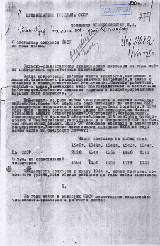 Справка о состоянии совхозов НКСХ в годы Великой Отечественной войны. 1 августа 1945 г.