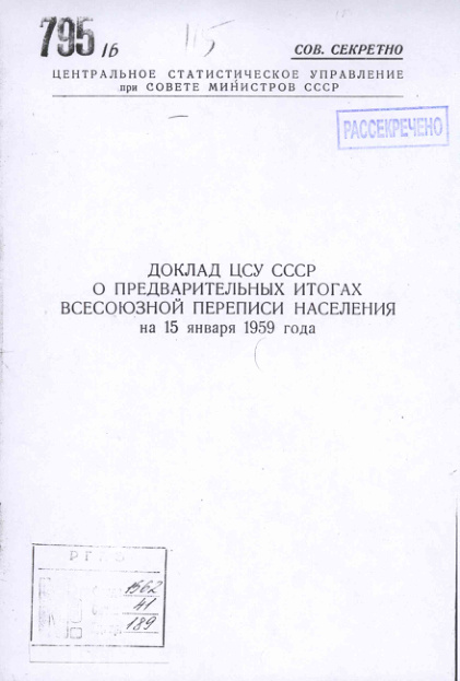 Доклад ЦСУ СССР о предварительных итогах всесоюзной переписи населения на 15 января 1959 года.