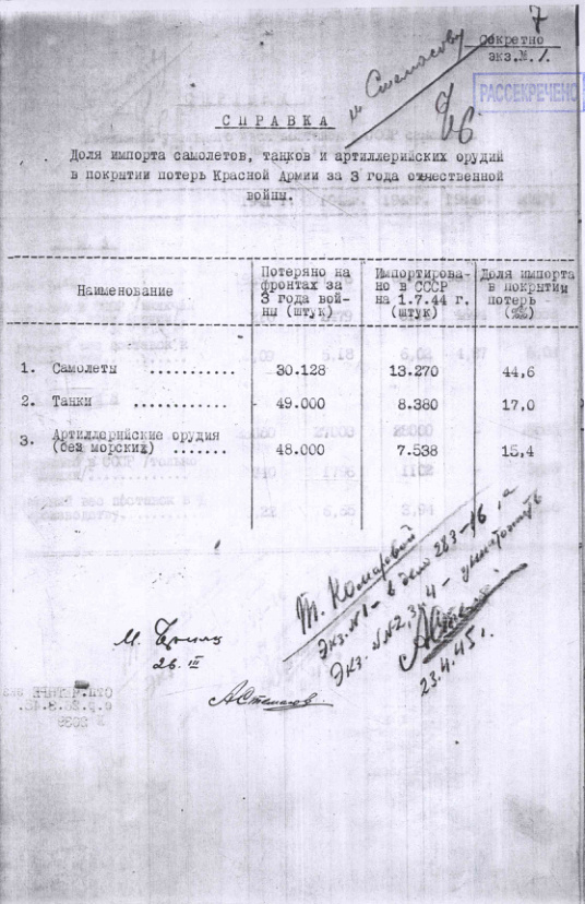 Справка о доле импорта самолетов, танков и артиллерийских орудий в покрытии потерь в 1941-1944 гг. 26 марта 1945 г.
