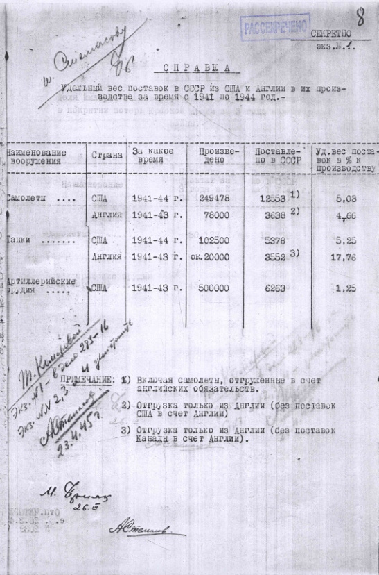 Справка об удельном весе поставок в СССР из США и Англии, и их производстве в 1941-1944 гг. 26 марта 1945 г.