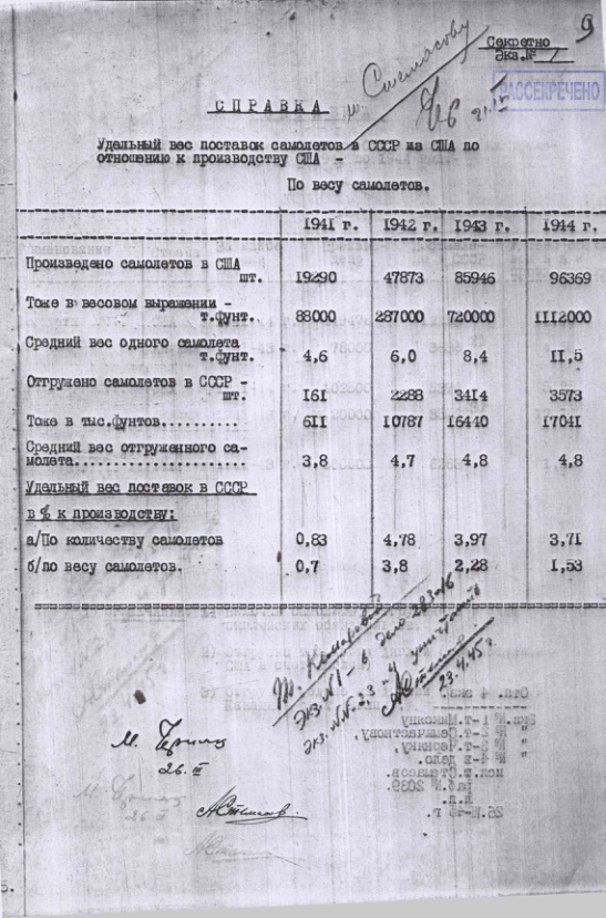 - Справка об удельном весе поставок самолетов в СССР из США по отношению к производству США в 1941-1944 гг. 26 марта 1945 г.