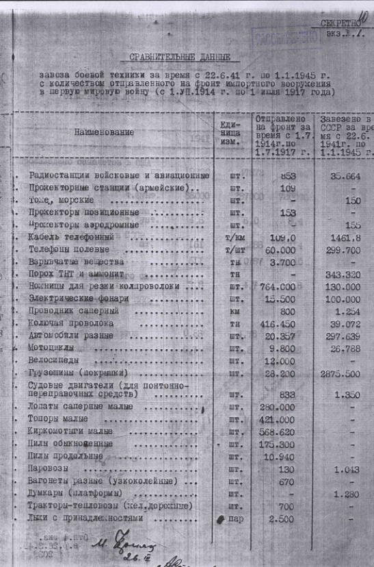 Сравнительные данные завоза боевой техники с 22.06.1941 по 01.01.1945 и в первую мировую войну. 26 марта 1945 г.