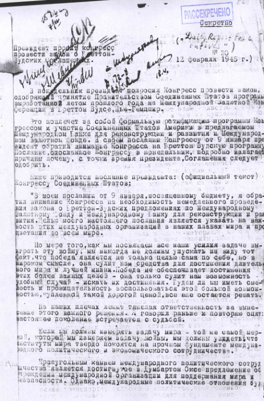 Докладная записка о послании президента США Ф.Рузвельта Конгрессу, о быстрейшем рассмотрении закона о МВФ и Международному банку. 13 февраля 1945 г.