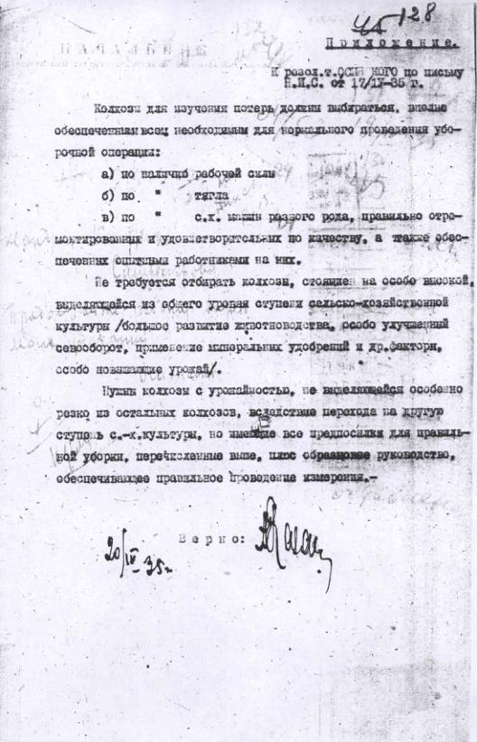 Приложение к письму В.В. Осинского с указаниями по измерению потерь в колхозах. 20 апреля 1935 г.