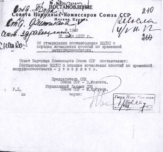 - Постановление №1229 СНК СССР. Об утверждении постановления ВЦСПС о порядке исчисления пособий по временной нетрудоспособности. 31 июля 1937 г.