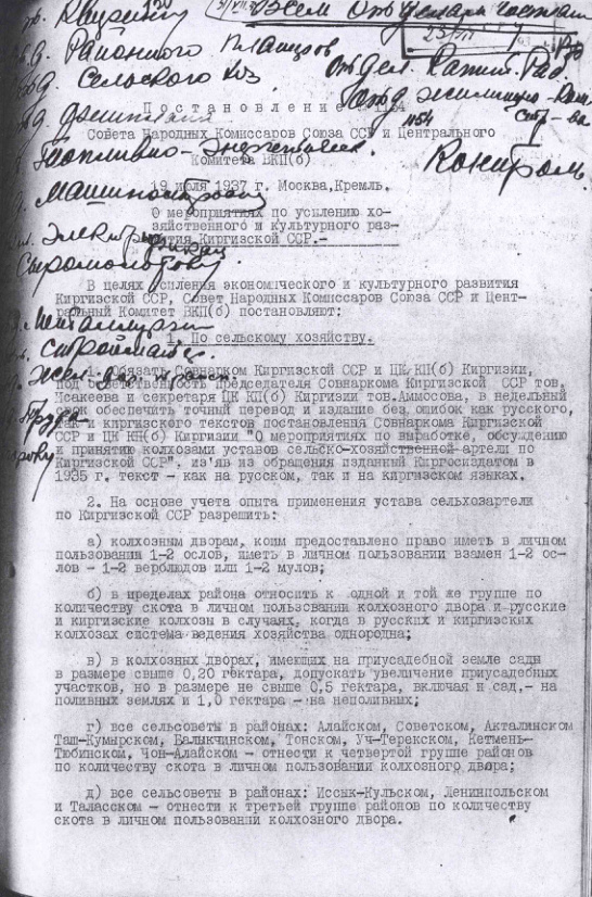 Постановление № 1154 СНК СССР и ЦК ВКП(б). О мероприятиях по усилению хозяйственного и культурного развития Киргизской ССР. 19 июля 1937 г.